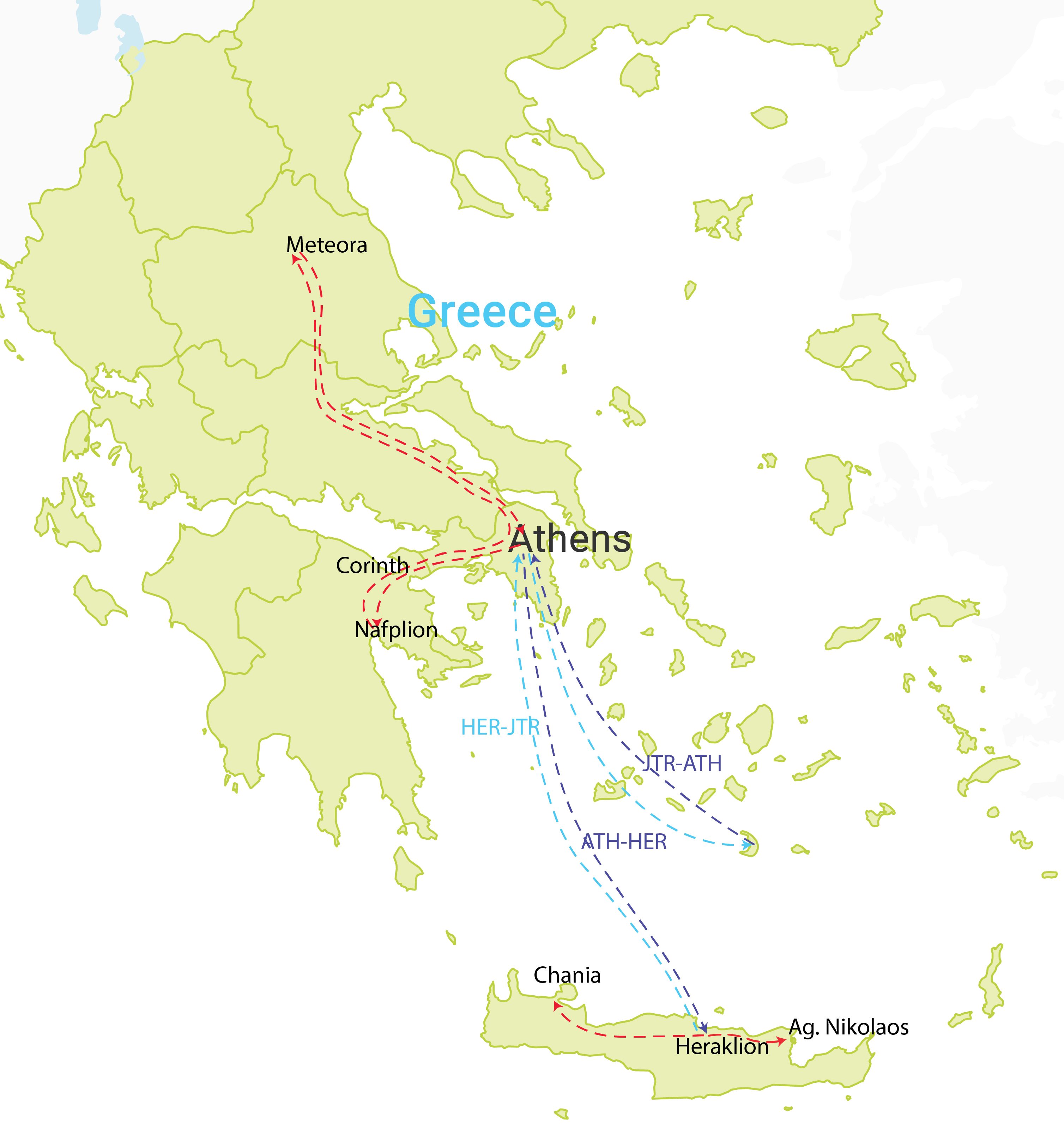 Light blue dashed lines indicate two-leg flight; Heraklion (HER) to Santorini (JTR) via Athens