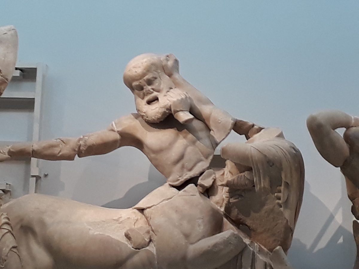 The eastern pediment of the Temple of Zeus depicts the chariot race between Pelops and Oinomaos, while the western pediment shows the fight between the centaurs and Lapiths at the wedding feast of Pirithous (the centaurs got drunk and tried to abduct the women; the story can be seen as an allegory for Classical Greek values and victories over ‘barbarians’). The metopes depict the Twelve Labours of Hercules; half the fun is trying to work out which is which from the remains alone.